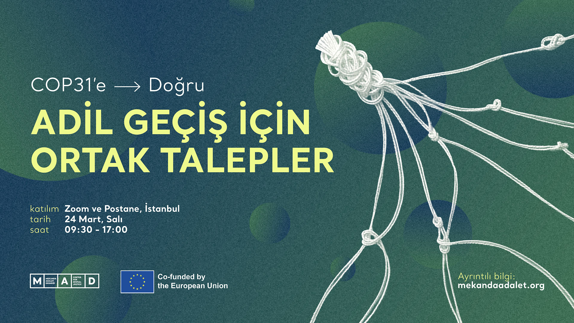 Türkiye’nin COP31’e ev sahipliği yapacak olması, iklim politikaları ve adil geçiş tartışmaları açısından sivil toplum için kritik bir fırsat sunuyor. Bu bağlamda, Mekanda Adalet Derneği olarak 24 Mart 2026 tarihinde düzenleyeceğimiz “COP31’e Doğru: Adil Geçiş İçin Ortak Talepler” etkinliğinde; sivil toplum aktörlerini, ağları ve uzmanları bir araya getiriyoruz.