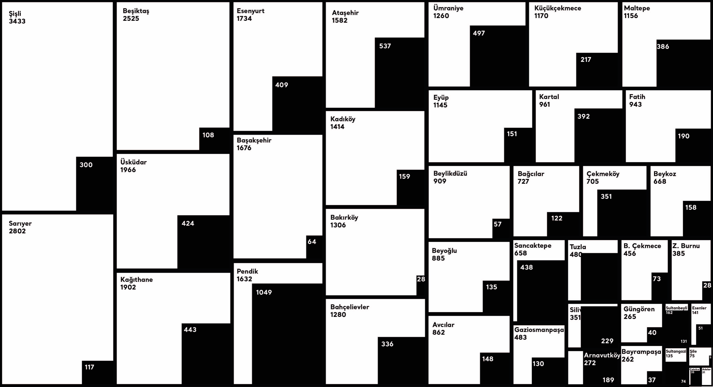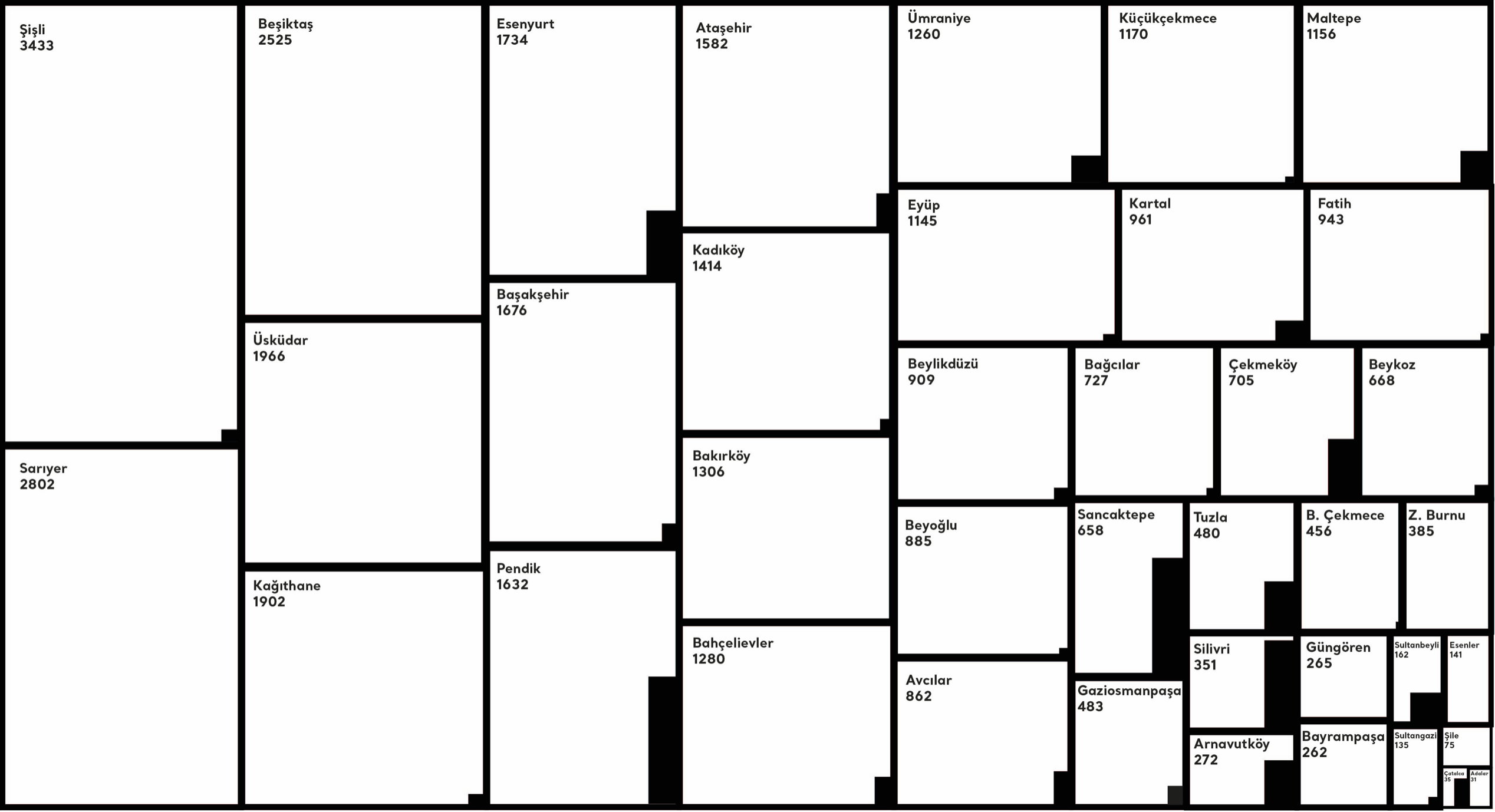 - İstanbul genelinde yaşamaya elverişli konut ilanı hiç bulunmayan ilçeler: Adalar, Bakırköy, Bayrampaşa, Esenler, Güngören, Sarıyer, Üsküdar, Zeytinburnu