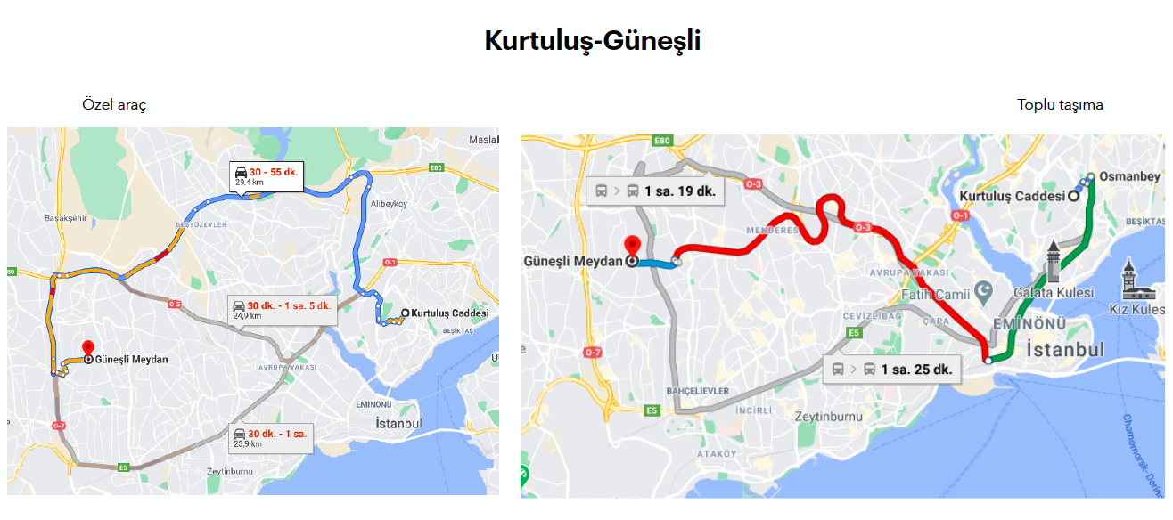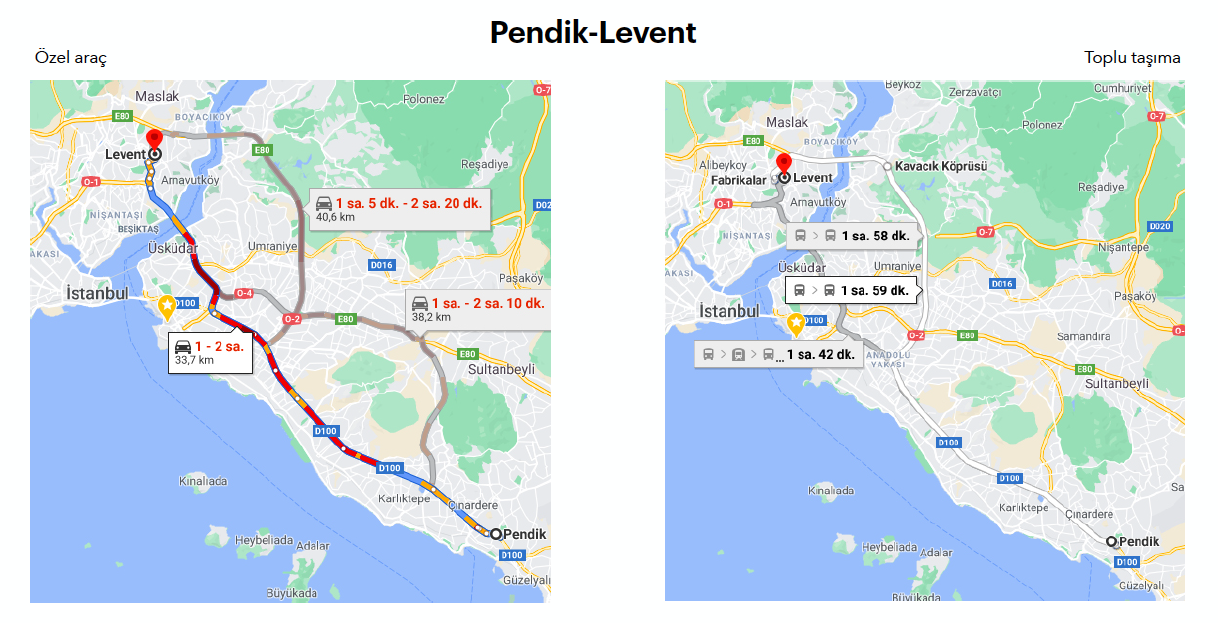 Çok basit şekilde Google Maps’te hesapladığımız tek yön yolculuk süreleri, toplu taşıma kullanımında 2 saate yakın, özel araç kullanımında ise 1-2 saat olarak çıktı. Toplu taşıma kullanımı en az 2 vasıta değiştirmeyi gerektiriyor.